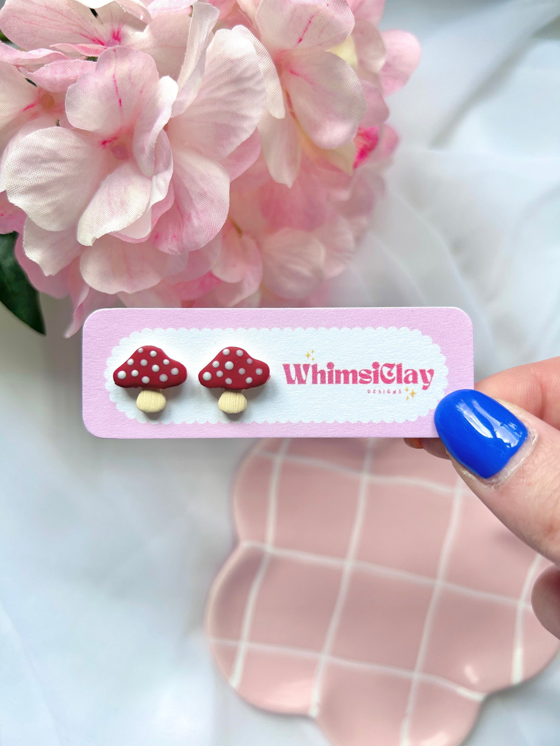 Mushroom stud earrings made with polymer clay and so cute and light to wear!
