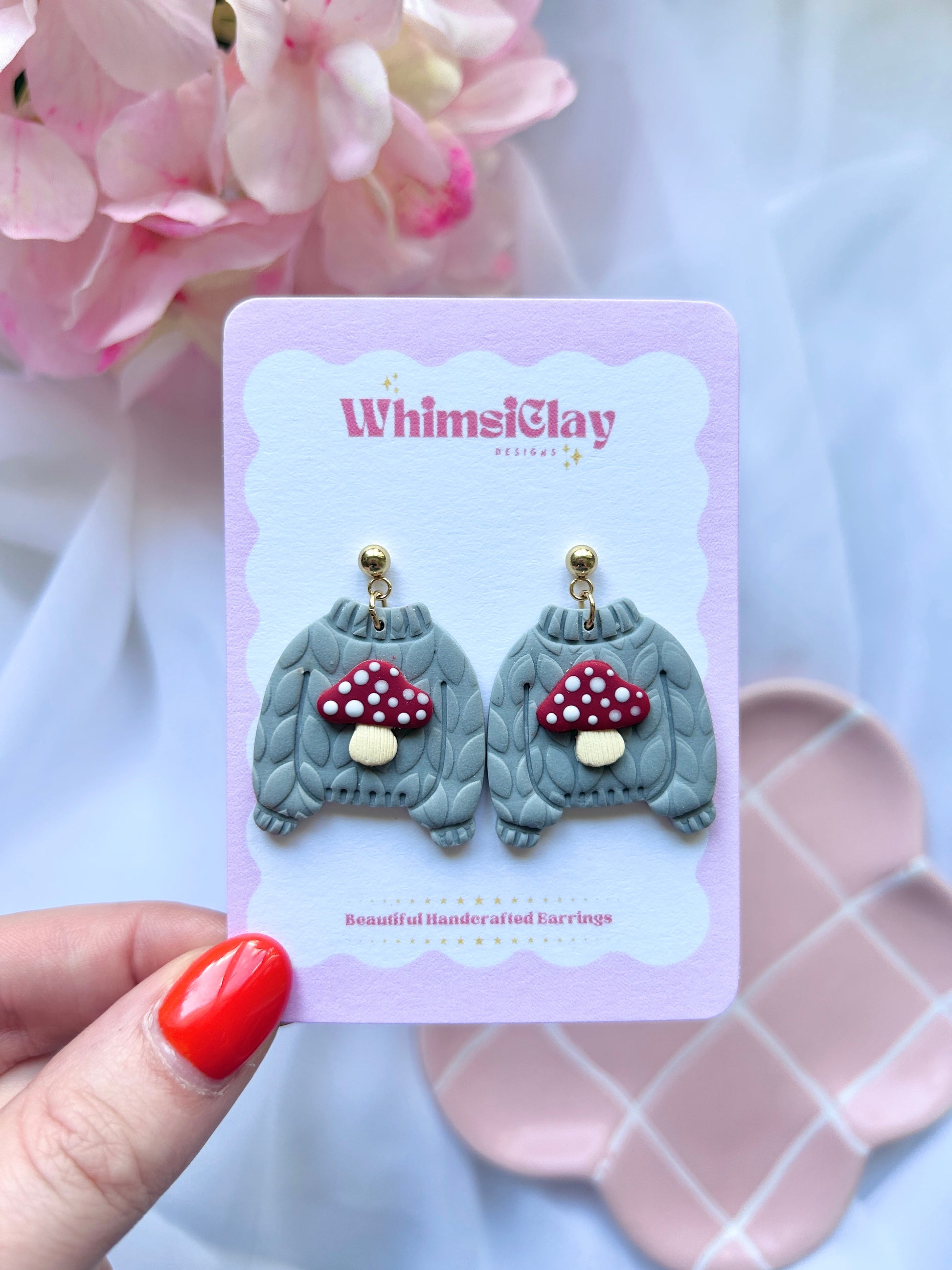Mushroom jumper earrings made with polymer clay and so cute and light to wear!